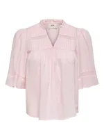 Toppen är designad med dekorativa sömmar som tillför struktur och karaktär, medan de 3/4-långa ärmarna med volangavslut skapar en lätt och romantisk känsla.