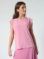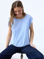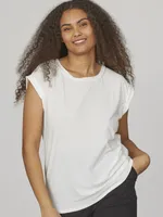 Denna topp är tillverkad i ett mjukt och följsamt jerseytyg som ger en bekväm känsla hela dagen. Designen är enkel och stilren med rund halsringning och en avslappnad silhuett som faller snyggt på kroppen. De diskreta, ton-i-ton-sömmarna bidrar till ett rent och minimalistiskt uttryck, medan den vadderade kanten ger en subtil struktur och form. Toppen avslutas med en rak fåll som förstärker det moderna intrycket.
