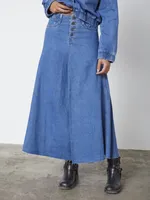 OSLA-SK1 är en lång denimkjol i lätt A-linje med fickor och knäppning framtill.