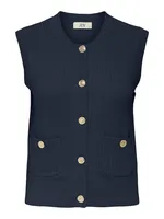 JDYSTELLA stickad väst utan ärmar är ett mångsidigt plagg som adderar både värme och stil till din outfit. Tillverkad i en mjuk bomulls- och akrylblandning som ger både komfort och hållbarhet. Den runda halsringningen och den tidlösa knäppningen framtill gör den enkel att styla, bär den över en skjorta för en klassisk look eller över en klänning för en mer trendig stil. Det släta flat knit-utförandet ger en elegant känsla, samtidigt som passformen är bekväm och feminin. Perfekt för höst- och vintergarderoben, och enkel att kombinera med både jeans och kjolar.